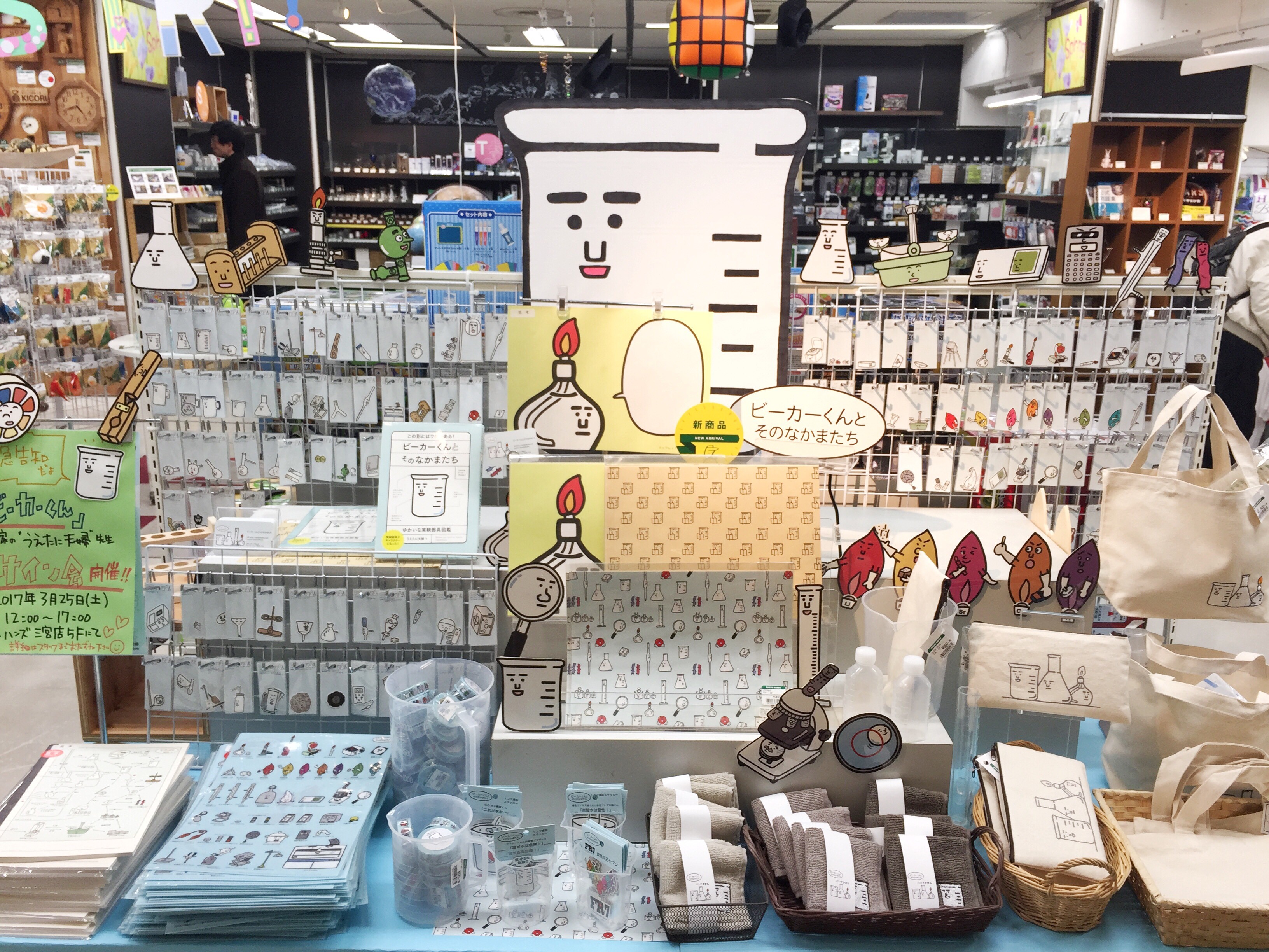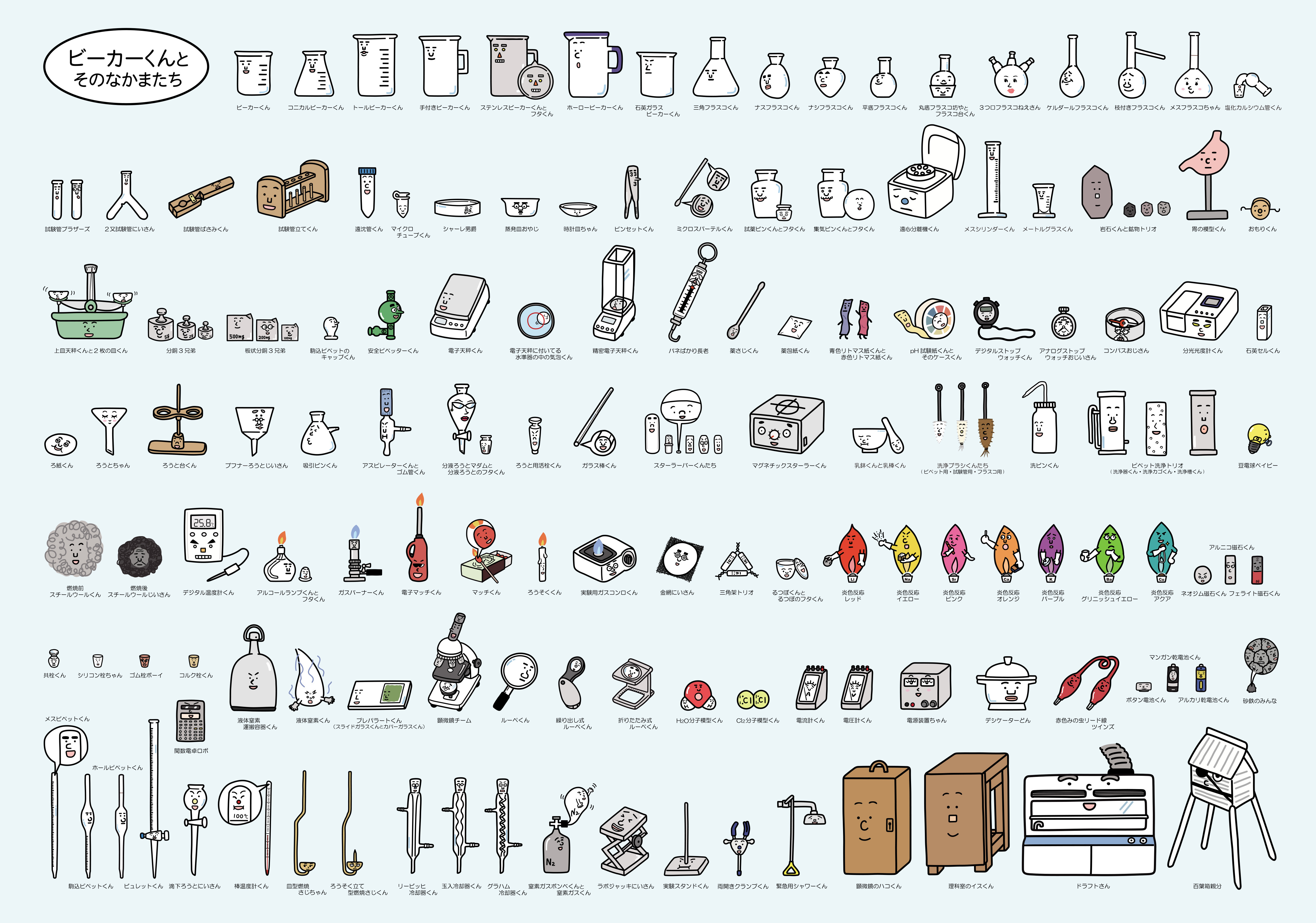 夫が普段仕事で使用していたビーカーたちをキャラクターにしてみようと考案して生まれた「ビーカーくんとそのなかまたち」最初はポストカードなどのちょっとしたグッズを販売するところから始まり、クリアファイルやマスキングテープなど種類を増やしていき、販売イベントなどで手売りする。